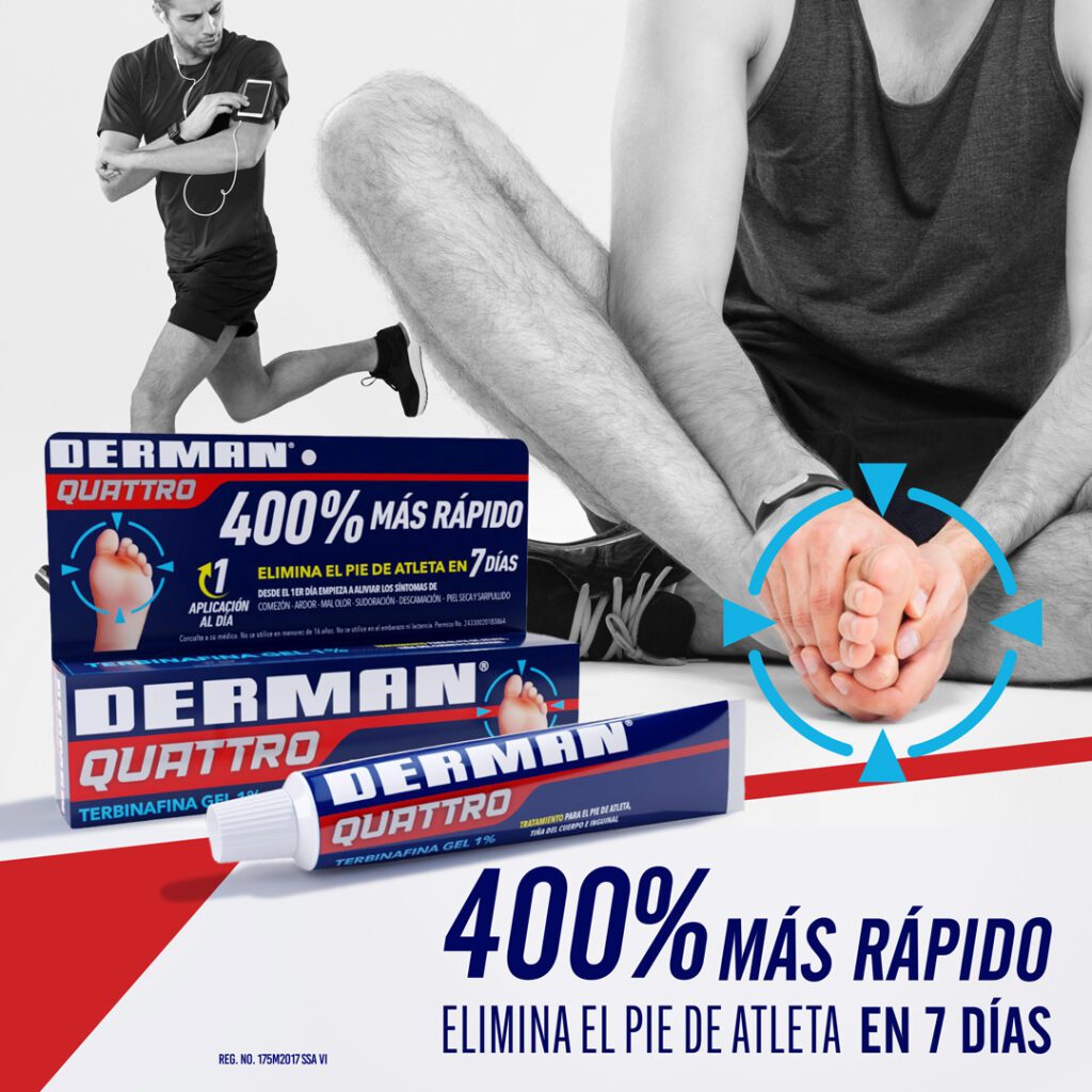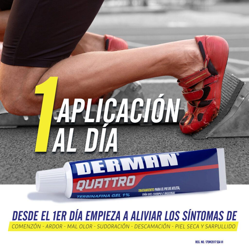 DERMAN® QUATTRO está indicado en el tratamiento del pie de atleta (tiña pedis – comezón, ardor, mal olor, sudoración en los pies); infecciones superficiales en la piel causadas por hongos en inglés (tiña inguinal – sarpullido y picazón inguinal) o manos, tórax, axilas (tiña corporal – sarpullido circular escamoso y picazón).